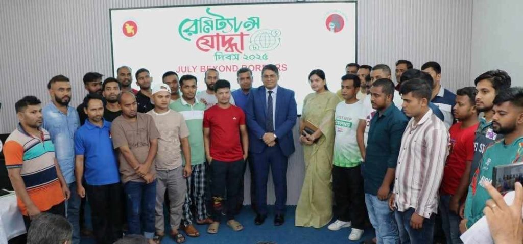 ‘রেমিট্যান্স যোদ্ধা দিবস-২০২৫’ উপলক্ষ্যে কনসাল জেনারেল-এর সভাপতিত্বে অনুষ্ঠিত আলোচনা সভার শুরুতে জুলাই শহীদদের স্মৃতির প্রতি শ্রদ্ধা জানিয়ে এক মিনিট নিরবতা পালন করা হয়।অনুষ্ঠানে ২০২৪-এর জুলাই-আগষ্ট আন্দোলনে রেমিট্যান্স যোদ্ধাদের অসামান্য ভূমিকার উপর নির্মিত একটি প্রামাণ্য চিত্র প্রদর্শিত হয় যেখানে বাংলাদেশের অর্থনীতিতে প্রবাসীদের বিশাল অবদান ও প্রবাসীদের জন্য সরকার কর্তৃক গৃহীত নানা পদক্ষেপের কথা তুলে ধরা হয়।