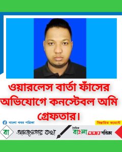চট্টগ্রাম মেট্রোপলিটন পুলিশের (সিএমপি) এক কনস্টেবলকে গ্রেপ্তার করা হয়েছে। ওয়্যারলেস বার্তা ফাঁসের অভিযোগে অমি দাশ নামে ওই কনস্টেবলকে রোববার দিবাগত রাতে খুলশী থানা এলাকা থেকে তাকে গ্রেপ্তার করে পুলিশ। তার বিরুদ্ধে অফিসিয়াল সিক্রেটস অ্যাক্টে মামলা করা হয়েছে। অমি দাশ পুলিশের টেলিকম ইউনিটের কনস্টেবল। তিনি প্রেষণে সিএমপির খুলশী থানায় কর্মরত রয়েছেন। অমি দাশের গ্রামের বাড়ি চট্টগ্রামের পটিয়ায়। তার বাবার নাম রাজিব দাশ।সিএমপির একজন ঊর্ধ্বতন কর্মকর্তা এসব তথ্য নিশ্চিত করেছেন।