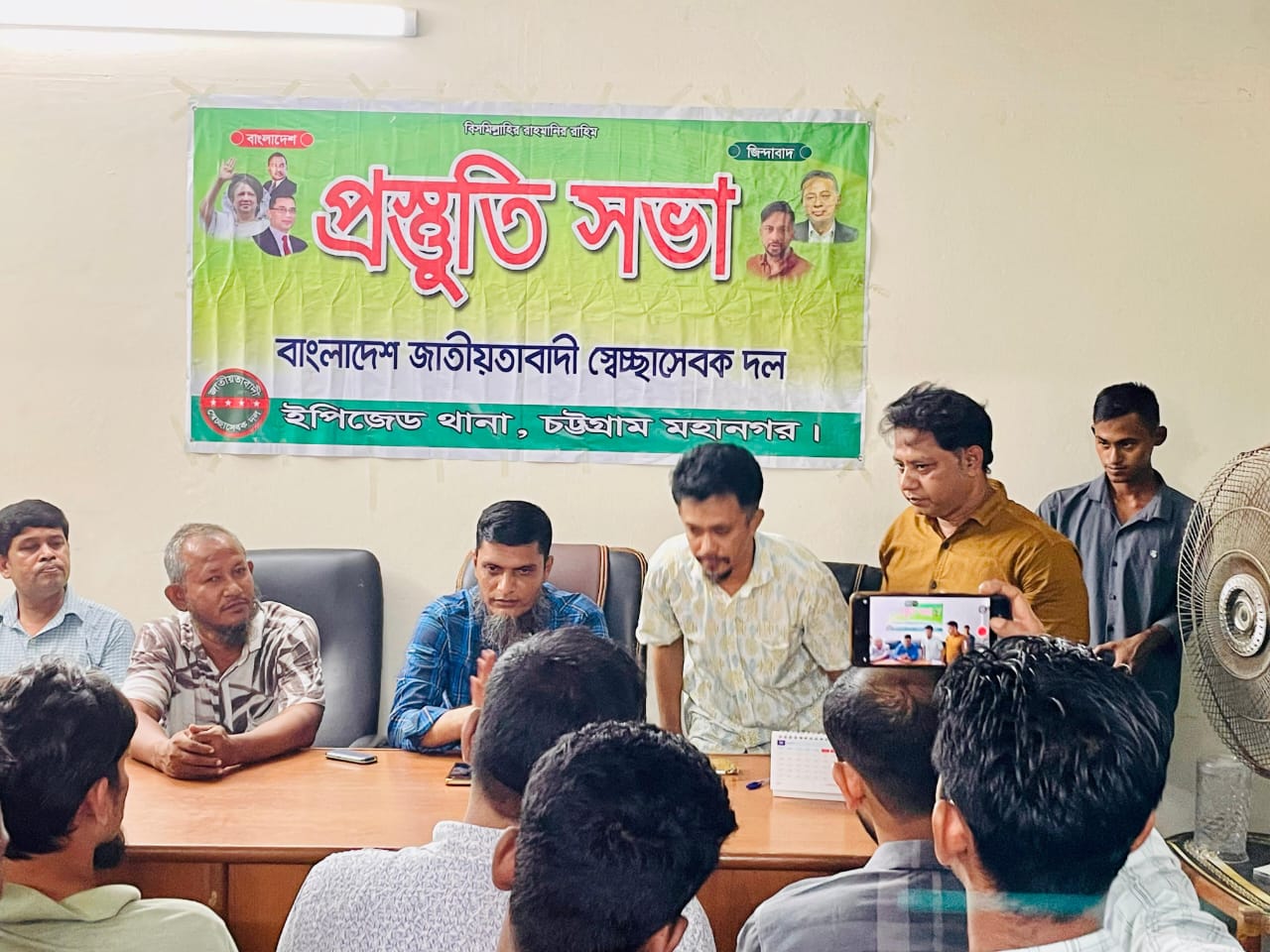 বাংলাদেশ জাতীয়তাবাদী স্বেচ্ছাসেবক দল চট্টগ্রাম মহানগর কমিটির আগামী ১৯ আগস্ট প্রতিষ্ঠাবার্ষিকী-২০২৫ উপলক্ষে এক প্রস্তুতি সভা ১৭ আগস্ট, রোববার সন্ধ্যায় ইপিজেডে স্বেচ্ছাসেবক দলের অস্থায়ী কার্যালয়ে সিনিয়র যুগ্ম আহ্বায়ক মোঃ আব্দুল মোবিনের সভাপতিত্বে ও স্বেচ্ছাসেবক দলের নেতা মোঃ আশরাফ উদ্দিন আল সাবা'র সঞ্চালনায় অনুষ্ঠিত প্রস্তুতি সভায় প্রধান অতিথি হিসেবে উপস্থিত ছিলেন ইপিজেড থানা স্বেচ্ছাসেবক দলের আহ্বায়ক মোঃ ইউসুফ সুমন।