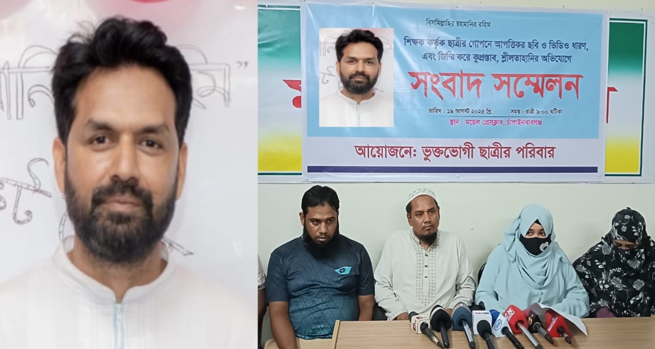 চাঁপাইনবাবগঞ্জে শিক্ষকের বিরুদ্ধে যৌন হয়রানীর অভিযোগ তুলে গভীর রাতে সংবাদ সম্মেলন করেছেন এক ছাত্রী।মঙ্গলবার রাত সাড়ে ১১টার দিকে চাঁপাইনবাবগঞ্জ মডেল প্রেসক্লাবে সংবাদ সম্মেলনের আয়োজন করেন শিক্ষক কর্তৃক যৌন হয়রানীর শিকার এক শিক্ষার্থী ও তার পরিবার। লিখিত বক্তব্যে ওই ছাত্র দাবি করেন- চাঁপাইনবাবগঞ্জ পৌরসভার ১১ ওয়ার্ডের নতুন হাট এলাকার আব্দুর রহমানের ছেলে মো.হেলাল উদ্দিন নিজ বাসায় হেলাল কোচিং সেন্টার নামে একটি প্রতিষ্টান পরিচালনা করেন। সে কোচিং সেন্টারের নিয়মিত শিক্ষার্থী ছিলেন ওই ছাত্রী। গত এপ্রিল মাসে শিক্ষক হেলাল উদ্দিন তার পরিবারসহ সকল শিক্ষার্থীদের নিয়ে শিক্ষা সফরে যান। সেখানে গোসল করা অবস্থায় ভেজা কাপড়ের একটি গোপন ছবি তোলে রাখেন শিক্ষক হেলাল উদ্দিন। সম্প্রতি ওই ছাত্রীর স্বামীর ব্যবহৃত ফেসবুক ম্যাসেঞ্জারে সেই ছবি পাঠিয়ে কু-প্রস্তাব দেন এবং বলে রাখেন শুধু মাত্র নমুনা পাঠালাম।