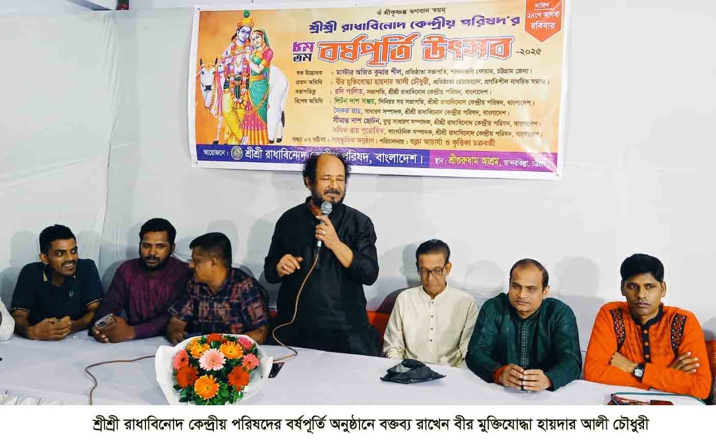 শ্রীশ্রী রাধাবিনোদ পরিষদের কর্মকান্ড সনাতনীদের মন জয় করেছে : বীর মুক্তিযোদ্ধা হায়দার আলী: শ্রীশ্রী রাধাবিনোদ কেন্দ্রীয় পরিষদের ৮ম বর্ষপূর্তি উদযাপন উপলক্ষে সংগঠনের সভাপতি রণি পালিতের সভাপতিত্বে আলোচনা সভা ও সঙ্গীত সন্ধ্যা ২৪শে আগষ্ট সন্ধ্যায় আন্দরকিল্লাস্থ গুরুধাম মন্দিরে অনুষ্ঠিত হয়। প্রধান অতিথি ছিলেন প্রগতিশীল নাগরিক সমাজ-এর প্রতিষ্ঠাতা চেয়ারম্যান বীর মুক্তিযোদ্ধা হায়দার আলী চৌধুরী।