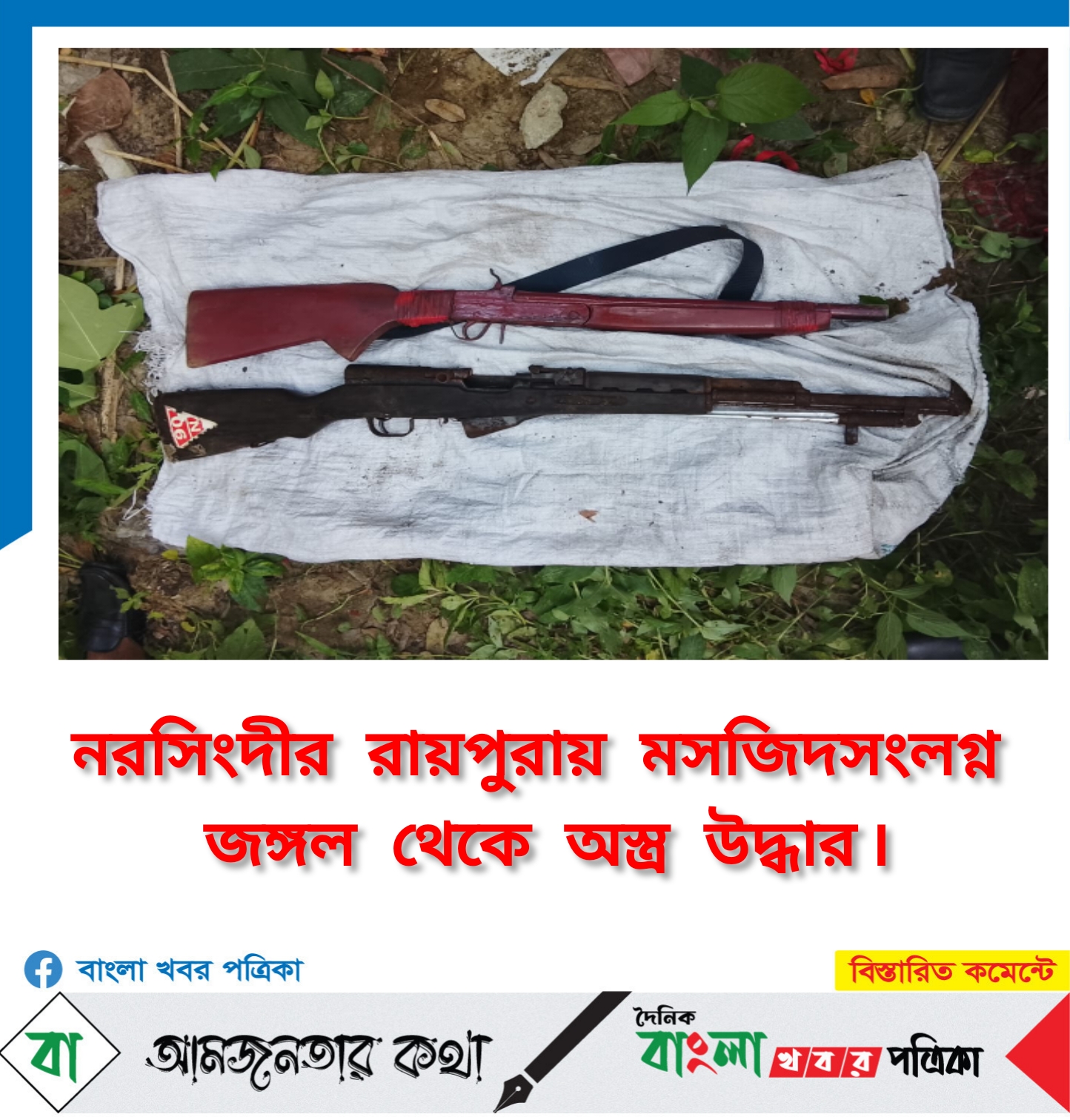 নরসিংদীর রায়পুরা উপজেলার আমিরগঞ্জ ইউনিয়নের বালুয়াকান্দি গ্রামের কাজল মিয়ার বাড়ির সংলগ্ন মসজিদের পাশের জঙ্গল থেকে অস্ত্র উদ্ধার করেছে জেলা গোয়েন্দা পুলিশ (ডিবি)।