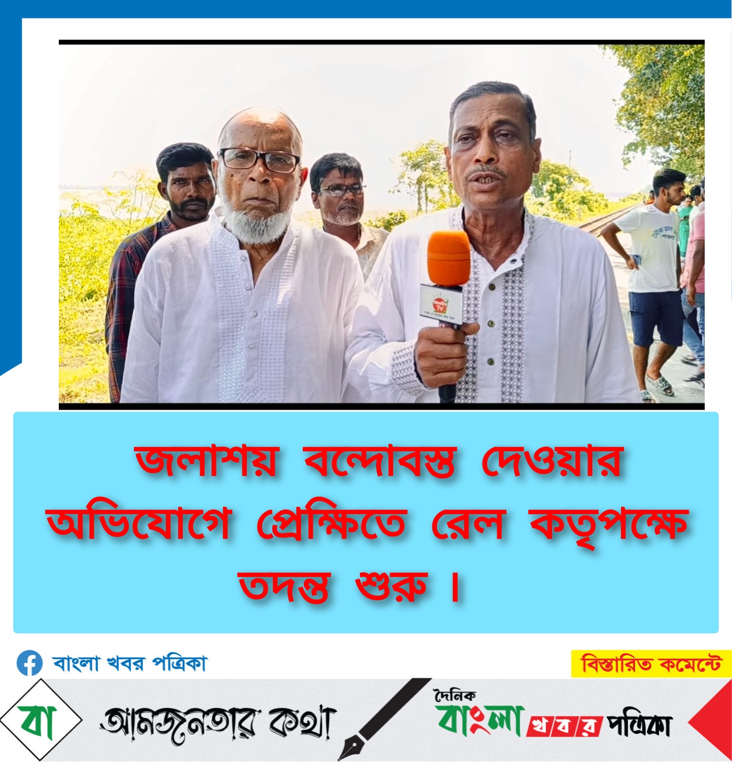 বাংলাদেশ সরকারের রেল আইন ভঙ্গ করে যুগের পর যুগ আওয়ামী সংসদের নামে রেলের জলাশয় বন্দোবস্ত দেওয়ায় অভিযোগের প্রেক্ষিতে তদন্ত কার্যক্রম শুরু করেছে পাকশী রেলওয়ে কতৃপক্ষ। মঙ্গলবার দুপুরে পাকশী রেল অঞ্চলের সহকারী ভু সম্পত্তি কর্মকর্তা মোঃ মামুন অর রশীদের নেতৃত্বে ৩ সদস্যের একটি তদন্ত কমিটি লাহিড়ী মোহনপুর টু দিলপাশার স্টেশনের মধ্যবর্তী পাবনা জেলার ভাঙ্গুড়া উপজেলার দিলপাশার মৌজার রেলসেতুর নিচের বিবাদমান জলাশয় পরিদর্শন করেন । এ সময় তদন্ত কমিটির অপর দুই সদস্য উল্লাপাড়া রেলস্টেশনের কর্মরত কানুনগো মোঃ শরিফুল ইসলাম এবং পাকশী হেড কোয়াটারের অফিস সহকারী মোঃ আহসান হাবীব উপস্থিত ছিলেন।