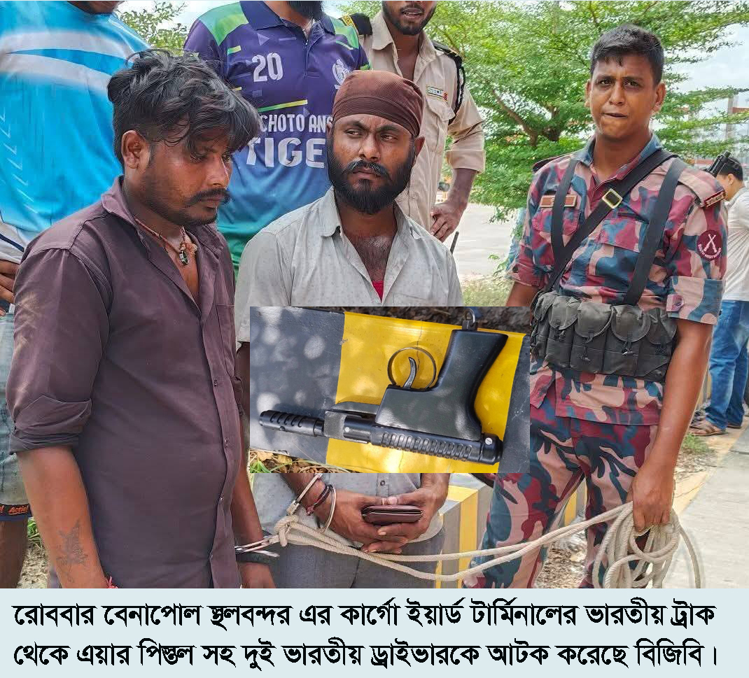 বেনাপোল বন্দরের কার্গো ভেহিকেল টার্মিনাল থেকে একটি ট্রাক থেকে ইয়ার পিস্তল ও গুলিসহ ভারতীয় ট্রাকের চালক ও সহকারীকে আটক করেছে বিজিবি সদস্যরা। এ ঘটনায় অস্ত্র আইনে মামলা দিয়ে পুলিশে সোপর্দ করা হয়েছে। বিজিবির ৪৯ ব্যাটালিয়নের সদস্যরা বেনাপোল বন্দরের টার্মিনাল থেকে তাদের আটকসহ ইয়ার পিস্তল ও গুলি উদ্ধার করে ।