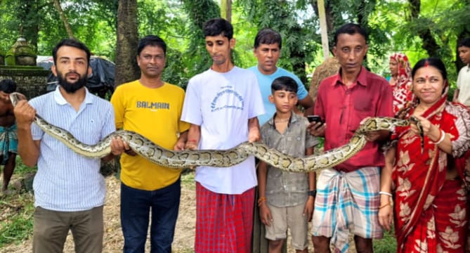 প্রত্যক্ষদর্শী বটন ঘোষ বলেন, গগন মাস্টার বাড়ির পাশের বিলের পানিতে মাছ ধরার জন্য ফাঁদ বসিয়েছিলাম। সকাল ৮টার দিকে সেটি তুলতে গিয়ে দেখি বিশাল এক অজগর সাপ আটকা পড়েছে। খবর পেয়ে ওয়াইল্ড লাইফ অ্যান্ড স্নেক রেসকিউ টিমের সদস্য আমির হোসাইন শাওন অজগরটি উদ্ধার করেন।
