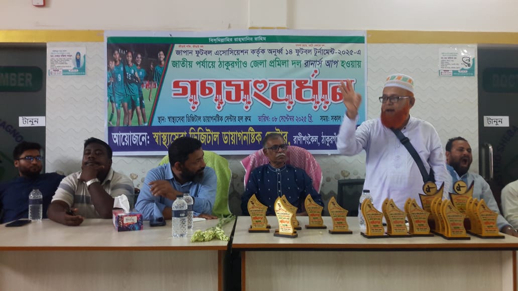 জাপান ফুটবল এসোসিয়েশন কর্তৃক অন‚র্ধ্ব ১৪ ফুটবল টুর্নামেন্টে জাতীয় পর্যায়ে ঠাকুরগাঁওয়ের রাণীশংকৈল রাঙ্গাটুঙ্গী প্রমিলা ফুটবল দল রানার্স আপ হওয়ায় বুধবার (৮অক্টোবর) স্বাস্থ্যসেবা ডিজিটাল ডায়াগনস্টিক সেন্টার এর আয়োজনে গণসংবর্ধনা দেওয়া হয়।