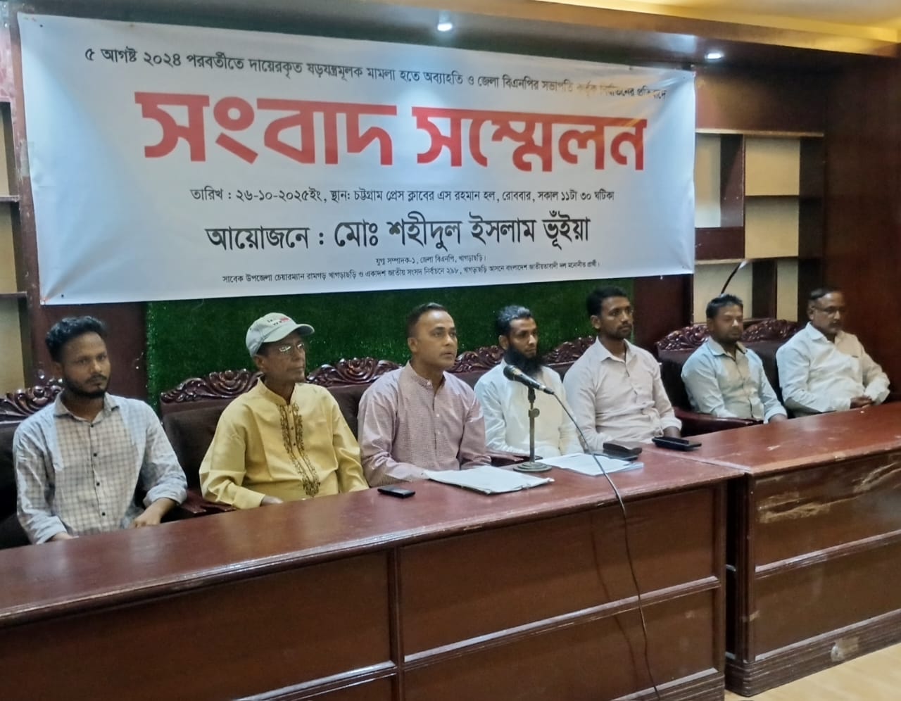 বাংলাদেশ জাতীয়তাবাদী দল (বিএনপি)’র দীর্ঘদিনের রাজনীতিক ও রামগড় উপজেলা পরিষদের সাবেক চেয়ারম্যান মো. শহিদুল ইসলাম ভূঁইয়া (ফরহাদ) তাঁর বিরুদ্ধে জেলা বিএনপির সভাপতি ও সাবেক সংসদ সদস্য ওয়াদুদ ভূঁইয়ার ষড়যন্ত্রের অভিযোগ করেছেন। শনিবার (তারিখ উল্লেখযোগ্য) খাগড়াছড়ি প্রেসক্লাবে আয়োজিত সংবাদ সম্মেলনে তিনি এই অভিযোগ তোলেন।