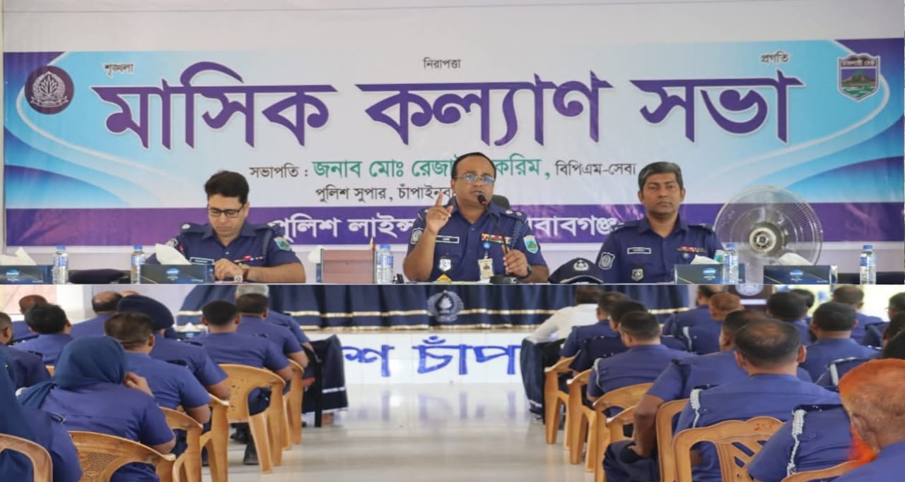 জেলা পুলিশ লাইন্সে ড্রিল শেডে মাসিক কল্যান সভায় চাঁপাইনবাবগঞ্জ পুলিশ সুপার মোঃ রেজাউল করিম, বিপিএম-সেবা উপস্থিত অফিসার ও ফোর্সদের উদ্দেশ্যে দিকনির্দেশনামূলক বক্তব্য প্রদান করেন এবং অফিসার ও ফোর্সদের সার্বিক কল্যাণ সংক্রান্ত বিভিন্ন বিষয় মনোযোগ সহকারে শোনেন এবং সংশ্লিষ্ট ইনচার্জবৃন্দকে কার্যকরী ব্যবস্থা গ্রহণের জন্য নির্দেশ প্রদান করেন।