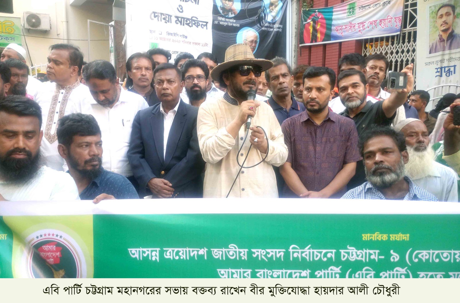 আসন্ন ত্রয়োদশ জাতীয় সংসদ নির্বাচনে চট্টগ্রাম-৯ (কোতোয়ালী ডবলমুরিং চান্দগাঁও) আসনে আমার বাংলাদেশ পার্টি (এবি পার্টি) হতে মনোনয়নপ্রাপ্ত প্রার্থী বীর মুক্তিযোদ্ধা হায়দার আলী চৌধুরীর সমর্থনে বৃহস্পতিবার বিকেলে চট্টগ্রাম প্রেস ক্লাবের সামনে জনসমাবেশ অনুষ্ঠিত হয়। সংগঠনের কেন্দ্রীয় কমিটির মুক্তিযুদ্ধ বিষয়ক সহ সম্পাদক বীর মুক্তিযোদ্ধা লায়ন হায়দার আলী চৌধুরীর সভাপতিত্বে উদ্বোধনী বক্তব্য রাখেন এবি পার্টি’র কেন্দ্রীয় কমিটির ভাইস চেয়ারম্যান ও চট্টগ্রাম-৮ আসনে মনোনয়নপ্রাপ্ত এড. গোলাম ফারুক। তিনি বলেন, আমার বাংলাদেশ পার্টি চব্বিশের গণ অভ্যুত্থানের অন্যতম প্রধান নেতৃত্বকারী দল।