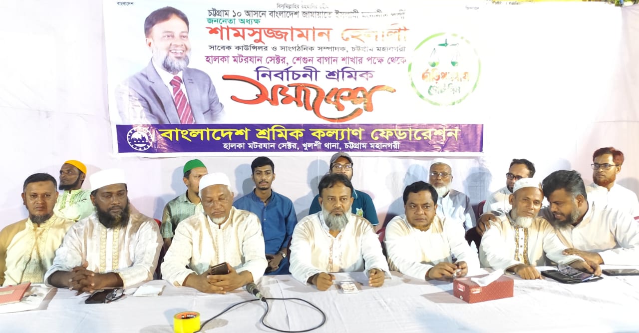 তিনি গতকাল রাতে বাংলাদেশ শ্রমিক কল্যাণ ফেডারেশন খুলশী থানার সেগুনবাগান হালকা মোটরযান সেক্টরের উদ্যোগে নির্বাচনী শ্রমিক সমাবেশে প্রধান অতিথির বক্তব্যে এসব কথা বলেন। সেক্টর সভাপতি নাসির উদ্দিন-এর সভাপতিত্বে এতে প্রধান বক্তা ছিলেন ফেডারেশনের কেন্দ্রীয় সহ-সাধারণ সম্পাদক ও নগর সভাপতি এস এম লুৎফর রহমান।