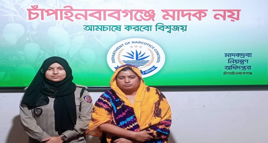 গ্রেফতারকৃত নারী চাঁপাইনবাবগঞ্জ পৌর এলাকার রামকৃষ্টপুর মহল্লার মোস্তাফিজুর রহমানের স্ত্রী ও গেলুনুর ওরফে গেলের মেয়ে বলে এক প্রেস বিজ্ঞপ্তির মাধ্যমে মাদকদ্রব্য নিয়ন্ত্রণ অধিদপ্তর চাঁপাইনবাবগঞ্জ কার্যলয়ের উপ-পরিচালক চৌধুরী ইমরুল হাসান জানান।