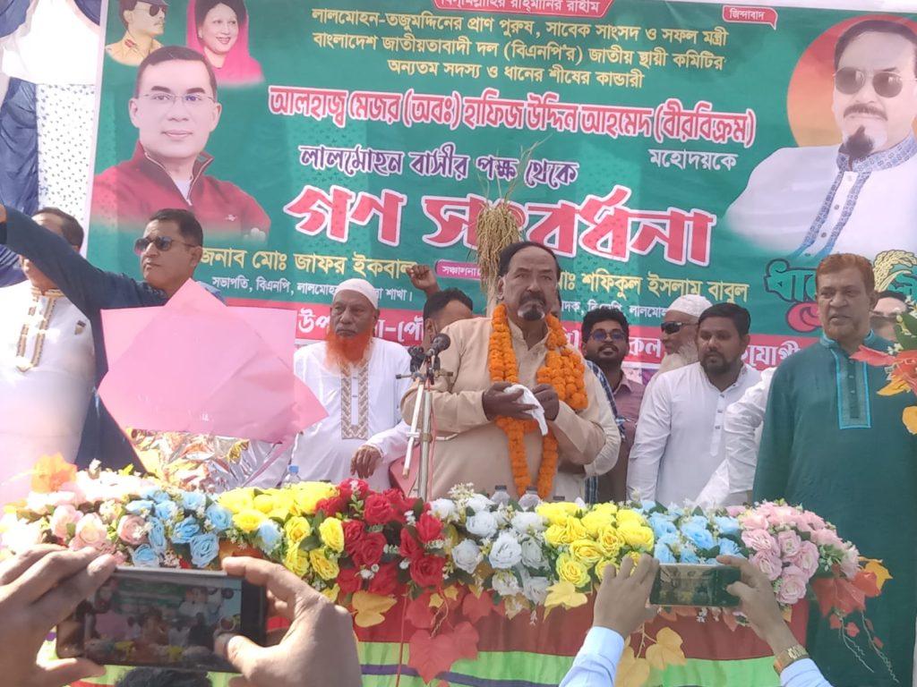 আসন্ন ত্রয়োদশ জাতীয় সংসদ নির্বাচনে ১১৭ ভোলা ৩ আসন থেকে বাংলাদেশ জাতীয়তাবাদী দল বিএনপির দলীয় মনোনয়ন পাওয়ার পর  লালমোহন সরকারি শাহবাজপুর কলেজ মাঠে ১৫ নভেম্বর ২০২৫ শনিবার দুপুরে জনতার উপচে পড়া ঢলে সংবর্ধিত হয়েছেন ছয়বারের সাবেক এমপি ও সাবেক মন্ত্রী মেজর ( অব.) হাফিজ উদ্দিন আহমেদ বীরবিক্রম।