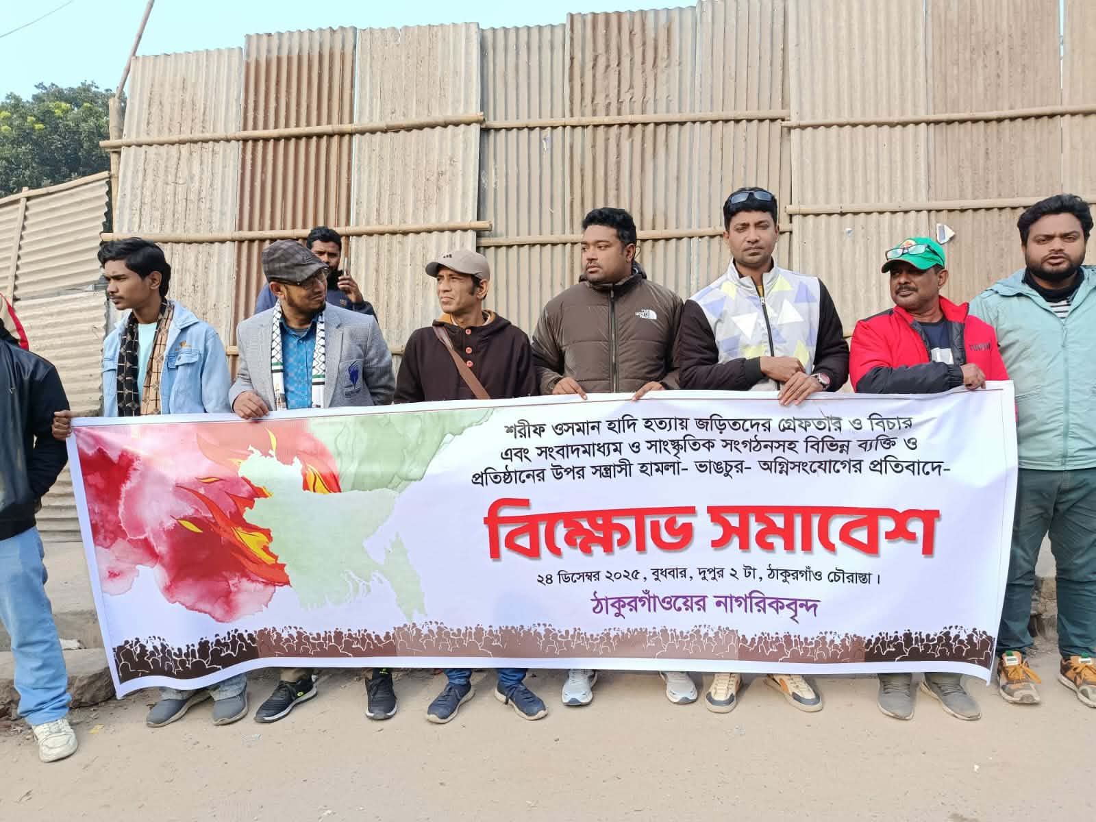 শরীফ ওসমান হাদি হত্যায় জড়িতদের গ্রেফতার করে বিচার এবং সংবাদমাধ্যম ও সাংস্কৃতিক সংগঠনসহ বিভিন্ন ব্যক্তি প্রতিষ্ঠানের উপর সন্ত্রাসী হামলা ভাঙচুর অগ্নিসংযোগের প্রতিবাদে ঠাকুরগাঁওয়ে বিক্ষোভ সমাবেশ অনুষ্ঠিত হয়েছে। বুধবার বিকেলে পৌর শহরের চৌরাস্তা এলাকায় ঠাকুরগাঁও নাগরিকবৃন্দ এর ব্যানারে এই বিক্ষোভ সমাবেশ অনুষ্ঠিত হয়।