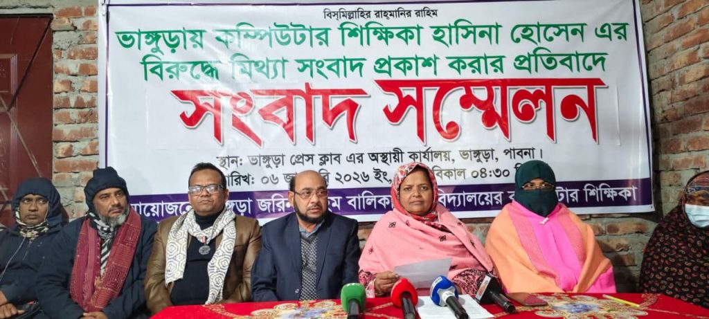 ৬ জানুয়ারি-২০২৬ মঙ্গলবার বিকাল ৫ ঘটিকায় ভাঙ্গুড়া প্রেসক্লাব এর অস্থায়ী হল রুমে এ সংবাদ সন্মেলন এর আয়োজন করেন। সংবাদ সন্মেলন শিক্ষিকা হাসিনা হোসেন লিখিত বক্তব্যে অভিযোগ করে বলেন গত ৩১ ডিসেম্বর-২০২৫ তারিখে কম্পিউটার ব্যবহার করতে জানেন না বিদ্যালয়ের কম্পিউটার শিক্ষক এই শিরোনামে একটি সংবাদ প্রকাশ করা হয়।