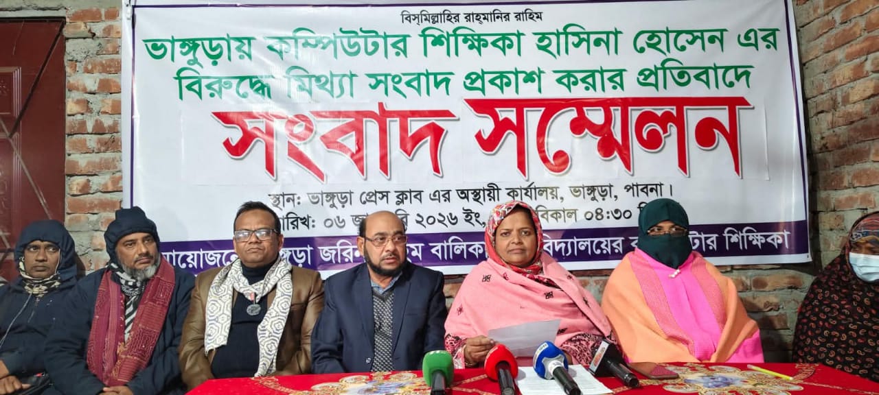 পাবনার ভাঙ্গুড়া উপজেলার জরিনা রহিম বালিকা উচ্চ বিদ্যালয় এর কম্পিউটার শিক্ষিকা হাসিনা হোসেন এর নামে মিথ্যা সংবাদ প্রকাশ করার প্রতিবাদে সংবাদ সন্মেলন করেন।