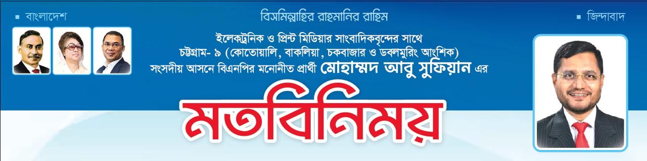 আগামীকাল রবিবার (১১ জানুয়ারী) দুপুর ১২ টায় নগরীর জামাল খানস্থ দাওয়াত রেস্টুরেন্টে চট্টগ্রাম- ৯ (কোতোয়ালি, বাকলিয়া, চকবাজার ও ডবলমুরিং আংশিক) সংসদীয় আসনে বিএনপির মনোনীত প্রার্থী মোহাম্মদ আবু সুফিয়ানের সাথে চট্টগ্রামে কর্মরত সাংবাদিকদের সঙ্গে এক মতবিনিময় সভার আয়োজন করা হয়েছে।