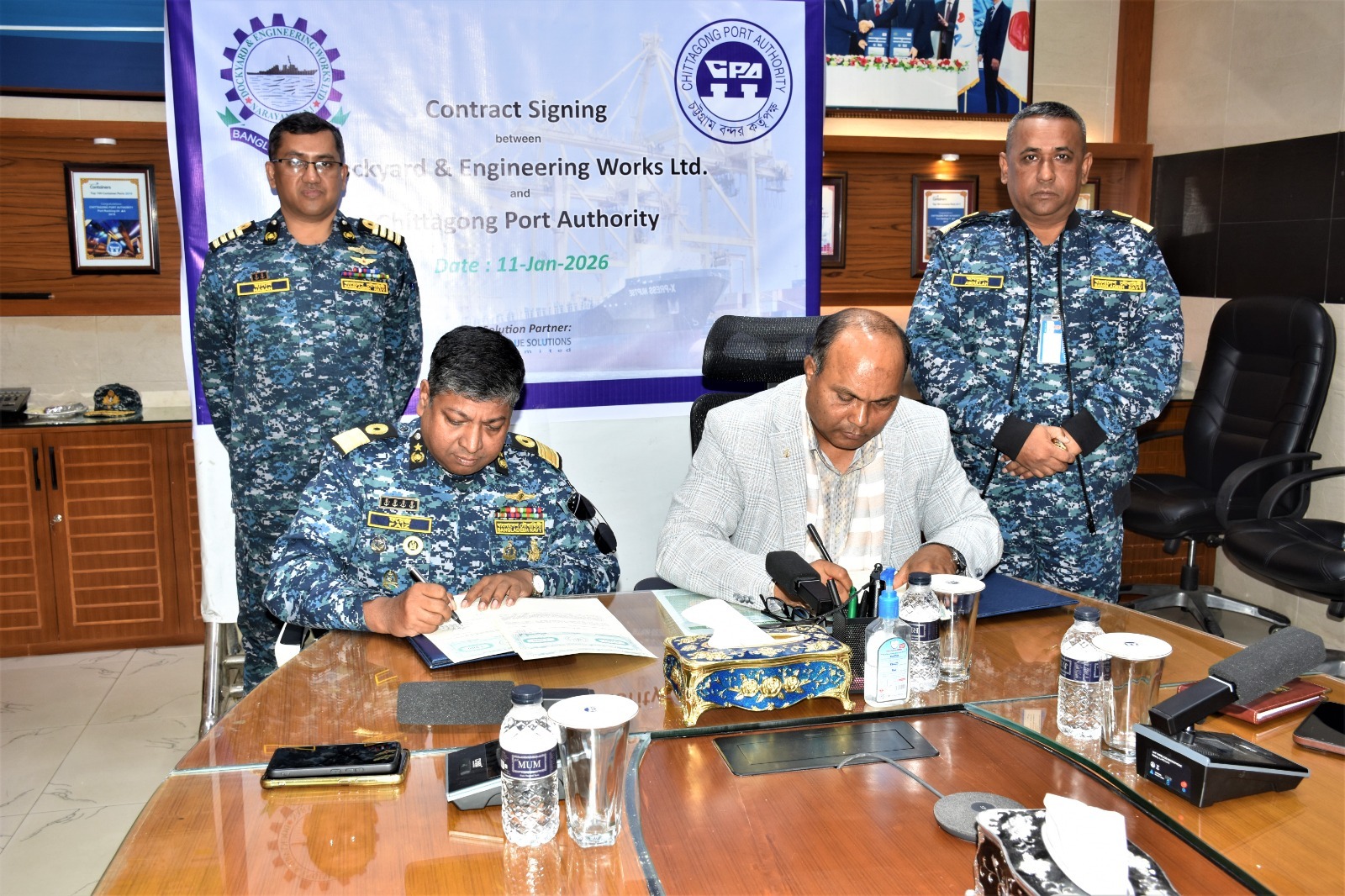 উক্ত চুক্তিতে চবক এর পক্ষে চট্টগ্রাম বন্দর কর্তৃপক্ষের মাননীয় চেয়ারম্যান রিয়ার এডমিরাল এস. এম. মনিরুজ্জামান এবং ডকইয়ার্ড এন্ড ইঞ্জিনিয়ারিং ওয়ার্কস লিমিটেড এর পক্ষে ম্যানেজিং ডিরেক্টর কমডোর মোহাম্মদ ফয়জুল হক স্বাক্ষর করেন। চুক্তি স্বাক্ষর অনুষ্ঠানে বন্দরের সদস্য (হারবার ও মেরিন) কমডোর আহমেদ আমিন আবদুল্লাহ, চবক এর পরিচালক (নিরাপত্তা) লেঃ কর্ণেল মোঃ জহিরুল ইসলাম, সিস্টেমস এনালিস্ট জনাব আকরাম চৌধুরীসহ উভয় প্রতিষ্ঠোনের ঊর্ধ্বতন কর্মকর্তাগণ উপস্থিত ছিলেন।