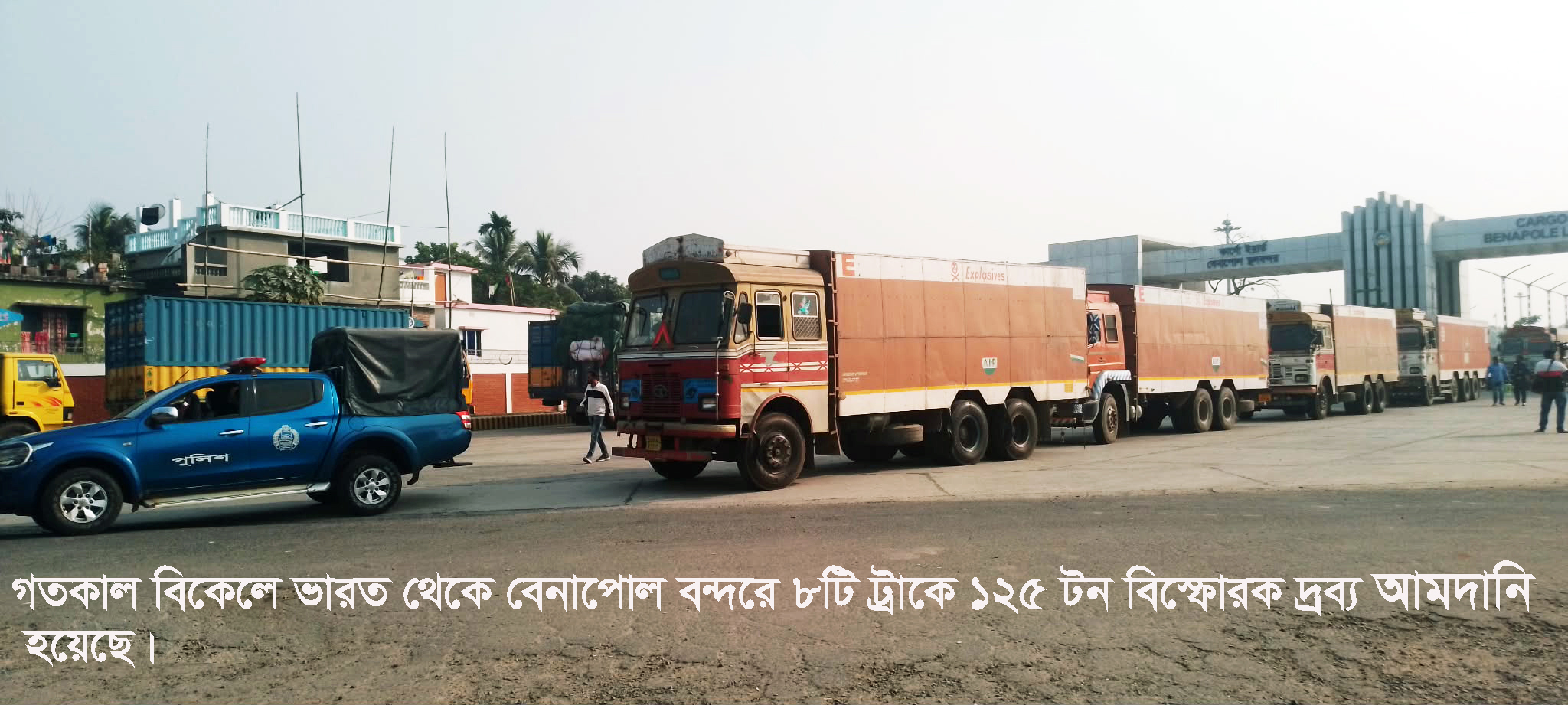 বেনাপোল স্থল বন্দর দিয়ে ভারত থেকে ৮টি ট্রাকে করে ১২৫ মেট্রিক টন বিস্ফোরক দ্রব্য প্রবেশ করেছে বাংলাদেশে। শনিবার (২৪ জানুয়ারী) বিকাল ৪ টায় ভারতের পেট্রাপোল স্থলবন্দর দিয়ে বিস্ফোরক দ্রব্য নিয়ে বেনাপোল বন্দরে প্রবেশ করে।