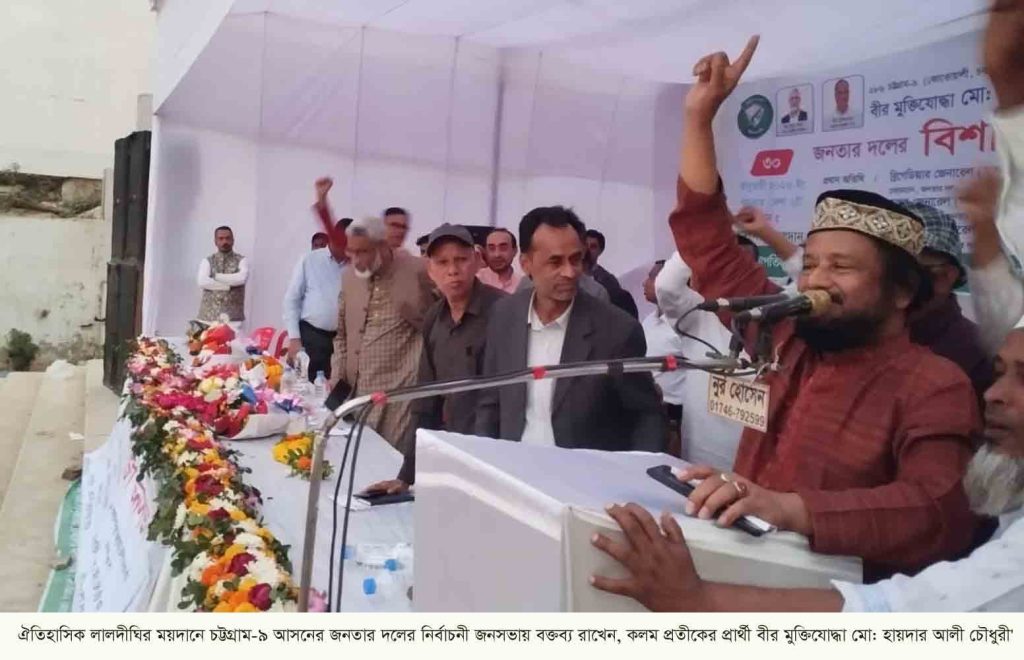 সভাপতির ভাষণে বীর মুক্তিযোদ্ধা হায়দার আলী চৌধুরী বলেন, বিগত ৫৪ বছরে দেশে এতো এতো মাদক ব্যবসায়ী, সন্ত্রাসী, চাঁদাবাজ, ভূমিদস্যু, অর্থ পাচারকারী ও মাফিয়া লুটেরা গোষ্ঠীর সৃষ্টি হয়েছে, তার বিরুদ্ধে কোন রাজনৈতিক সংগঠন বা কোন নেতা একটিও সৃষ্টি হয়নি। জনতার দল দেশ ও জাতির কল্যাণে সকল ধর্মের মানুষের জন্য সমান অধিকার, নিরাপত্তা ও ইনসাফ বিশেষ করে মহান মুক্তিযুদ্ধের মূল চেতনা সাম্য, মানবিক মর্যাদা ও সামাজিক ন্যায়বিচার প্রতিষ্ঠার জন্য জীবন বাজি রেখে গরীব দুঃখী খেটে খাওয়া অসহায় মেহনতি মানুষের মুক্তি দিতে প্রতিশ্রুতিবদ্ধ। উদ্বোধন করেন জনতার দলের নৈতিক কমিটি প্রধান মেজর জেনারেল (অব:) মাহবুবুল আলম। বিশেষ অতিথি ছিলেন, জনতার দলের কৌশলগত উপদেষ্টা লেফটেন্যান্ট জেনারেল সাব্বির আহমেদ, প্রধান সমন্বয়ক ও মুখপাত্র মেজর (অব:) ডেল এইচ খান, প্রধান আলোচক ছিলেণ, মহাসচিব বীর মুক্তিযোদ্ধা জনাব আজম খাঁন। সভায় অন্যান্যের মধ্যে আরো বক্তব্য রাখেন,রেজাউল করিম রাকিবুল, কৃষিবিদ যদু সিংহ, এডভোকেট গিয়াসউদ্দিন ও শ্যামল দাশ প্রমূখ নেতৃবৃন্দ।