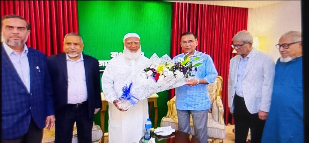 বিএনপির চেয়ারম্যান তারেক রহমান জামায়াতে ইসলামের আমির ডা. শফিকুর রহমানের সঙ্গে সৌজন্য সাক্ষাৎ করতে তার বাসায় যান।এ সময় বিএনপির চেয়ারম্যান তারেক রহমানকে ফুলেল শুভেচ্ছা জানান জামায়াত আমির ডা. শফিকুর রহমান।