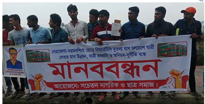 নেত্রকোণা-ময়মনসিংহ সড়কে বিআরটিসি দোতলা বাসে যাত্রীসেবার মান উন্নয়ন, যাত্রী হয়রানি বন্ধ এবং ব্যাপক অনিয়ম-দুর্নীতির প্রতিবাদে মানববন্ধন কর্মসূচি পালন করা হয়েছে। আজ বৃহস্পতিবার দুপুর ১২টায় নেত্রকোণা বিআরটিসি বাস স্ট্যান্ড এলাকায় ‘সচেতন নাগরিক ও ছাত্র সমাজ’-এর ব্যানারে এই প্রতিবাদ সভা ও মানববন্ধন অনুষ্ঠিত হয়।যাত্রীদের অভিযোগ ও ভোগান্তি